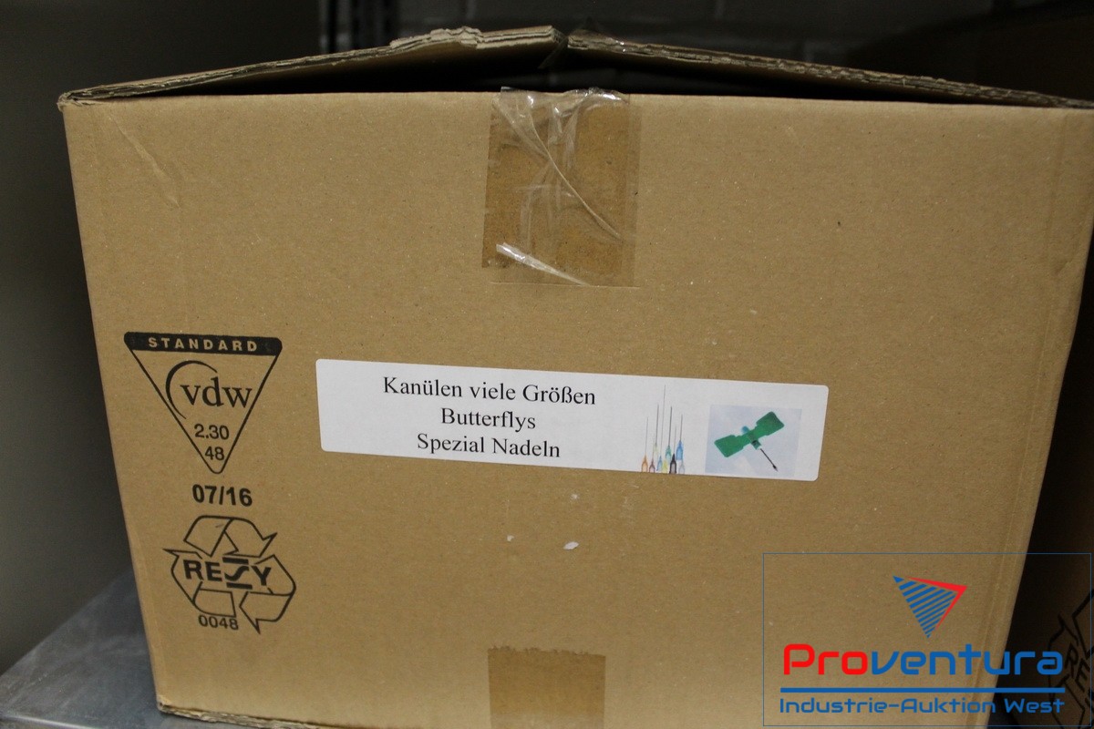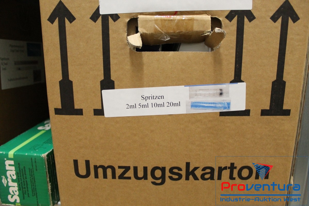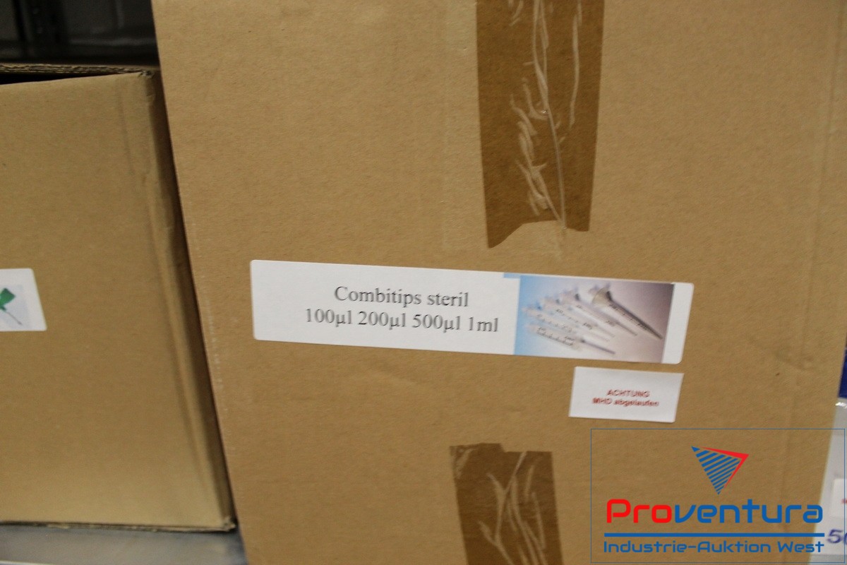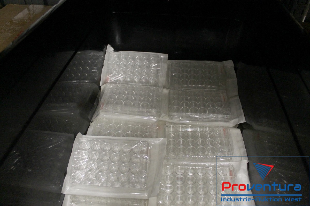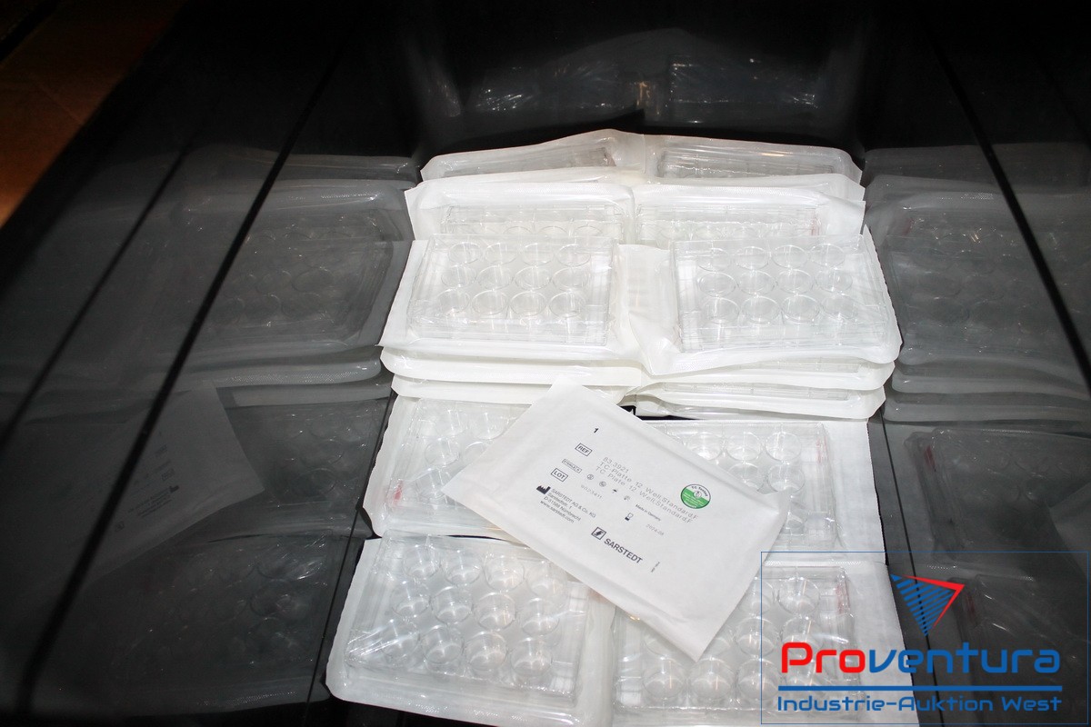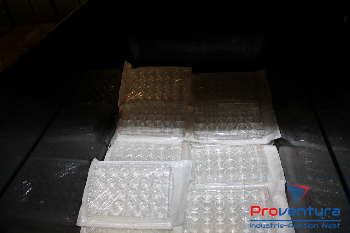 Verbrauchsmaterial, ca. 40 Kunststoff-Transportboxen mit Deckel, ca. 50 Kartons, unterschiedl. Inhalte, Kunststoffflaschen, Mikrotestplatten, Zellkulturplatten, Reagiergefäße, Röhren, Eindruckstopfen, Reagenz- und Zentrifugenröhren, Pipettenspitzen, Reagiergefäße, TC-Platten, Kanülen, Kombitips, siehe Fotos