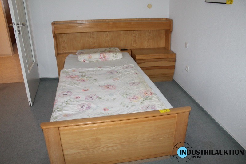 Bett mit Überbau und dazugehörigem Nachttisch, Schubladenkommode mit Spiegel