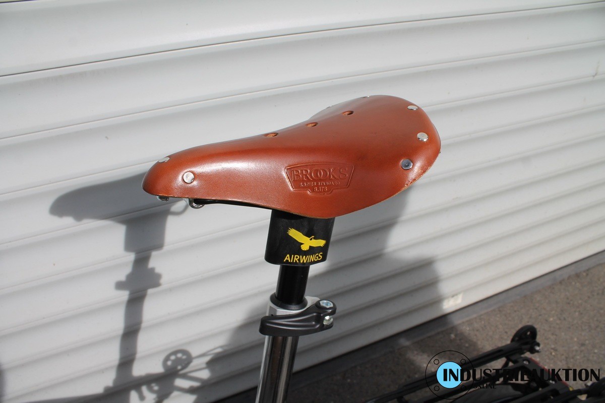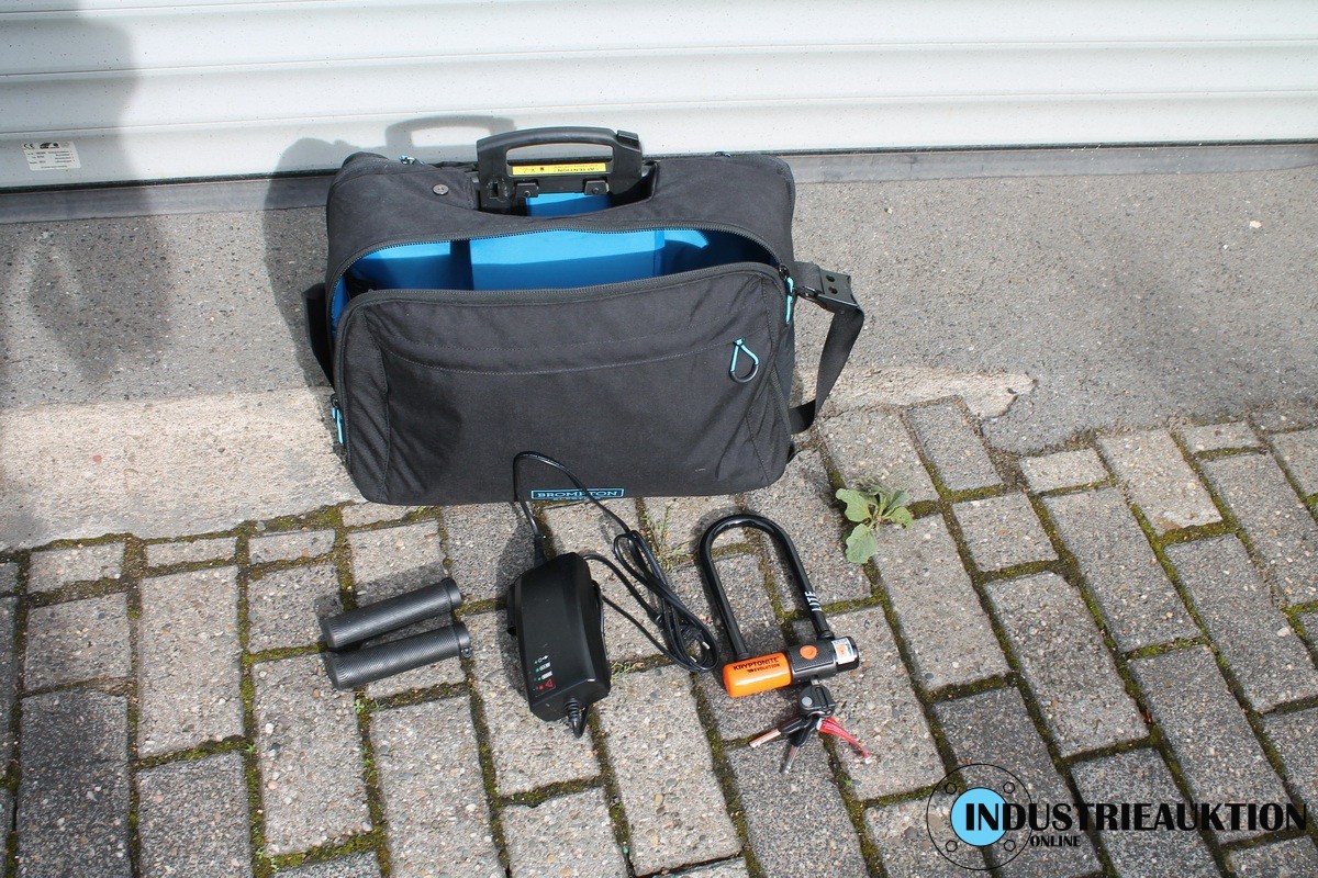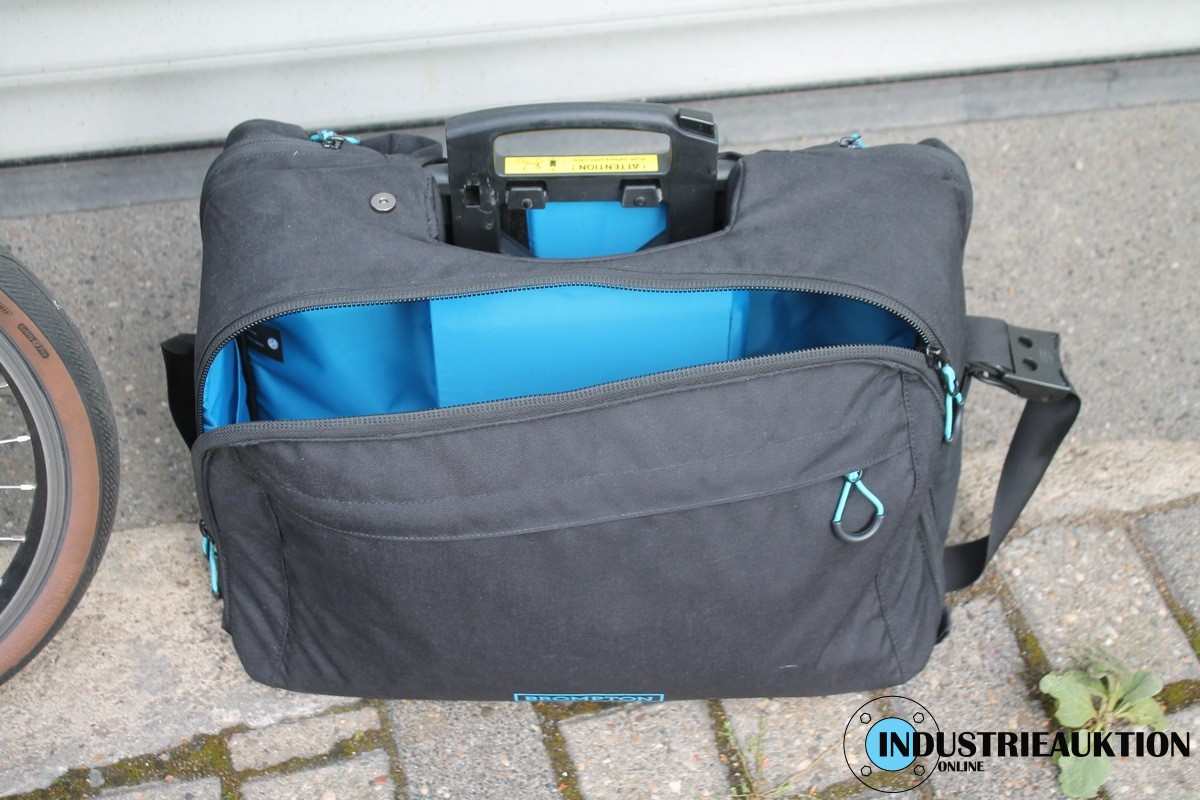 E-Faltbike Brompton Electric, Rahmennr. 892961, angeschafft 09/22, Rahmengr. 16", Schwarz, 6-Gang Nabenschaltung, BROOKS Leder-Sattel und Griffe, Gepäckträger mit Rollen, große Citybag Fronttasche, kleine Batterietasche, AIRWINGS Feder-Sattelstütze, ehem. Kaufpreis 4.435,−