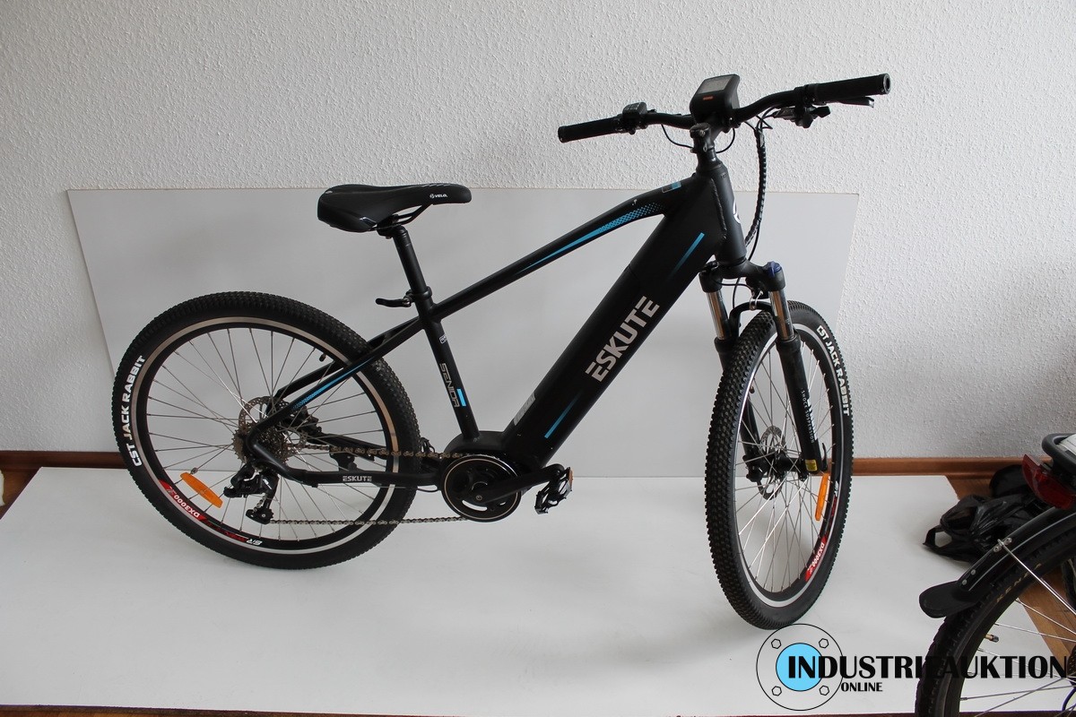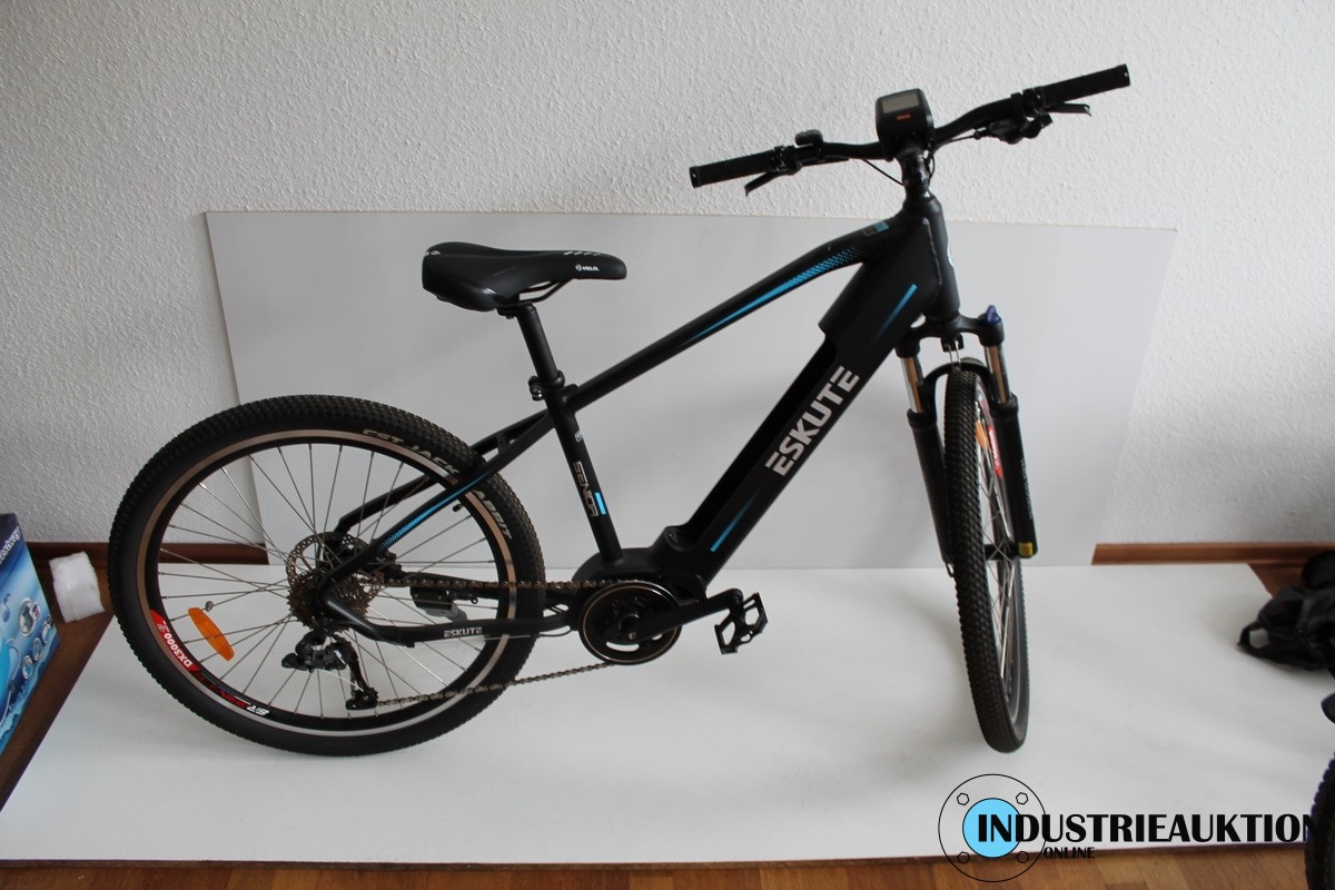 E-Mountainbike ESKUTE Voyager PRO, E0501, S/N 242422101010497, Bj. 03/22, abgel. Km-Stand 250, schwarz, Federgabel, vorne, Rahmengröße 41 cm, Sitzhöhe 83-101 cm, Motor 36V 250W 65 Nm, für Akku 540 WH: 36V 15AH, Schaltung Shimano 9 Gänge, Scheibenbremsen, Reifen 27,5”x 2,1” Reichweite bis zu 100km, Ladegerät - ohne Akku