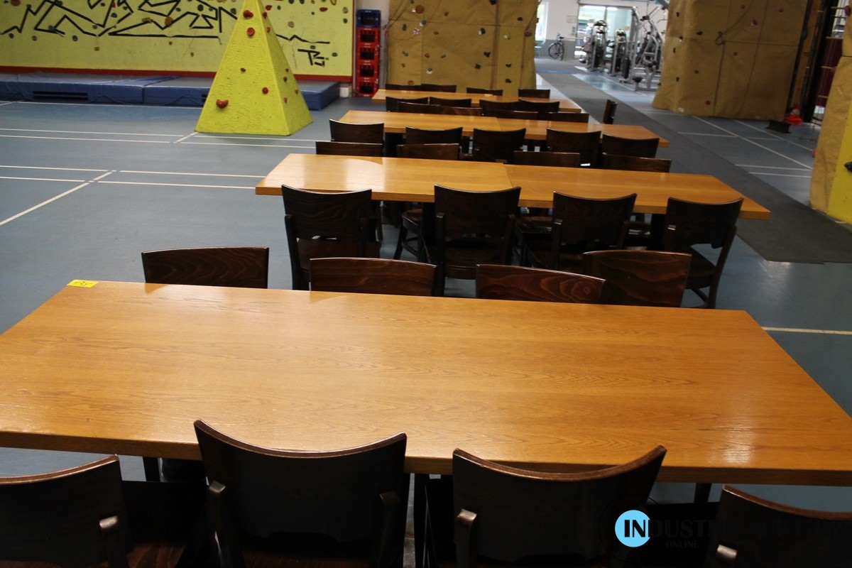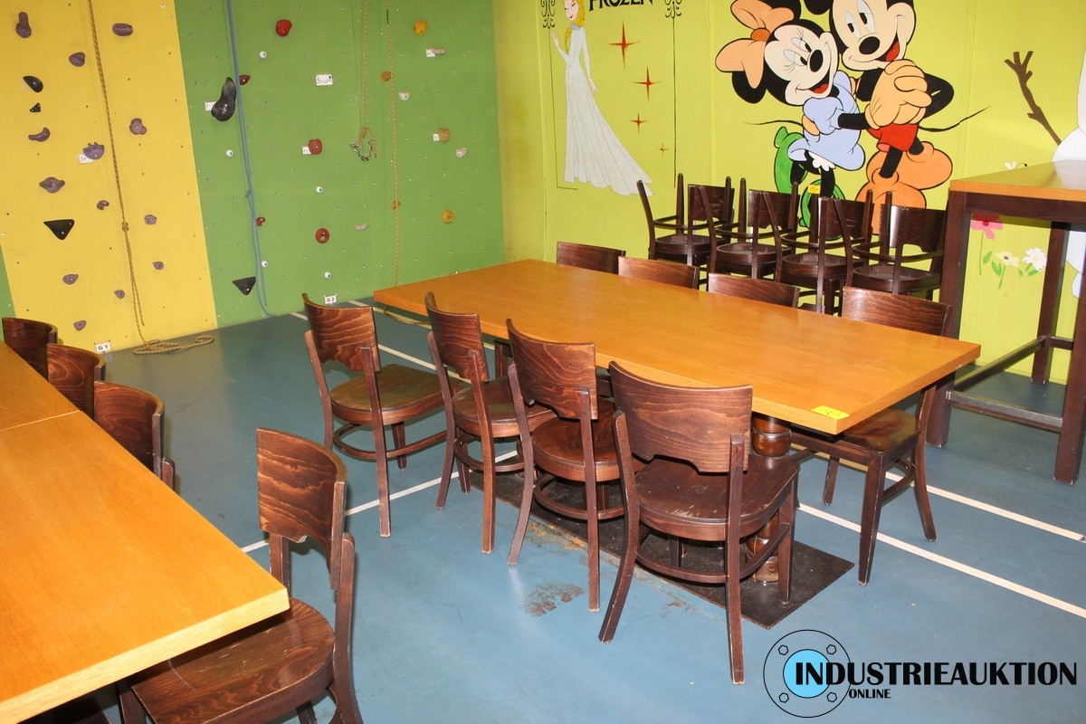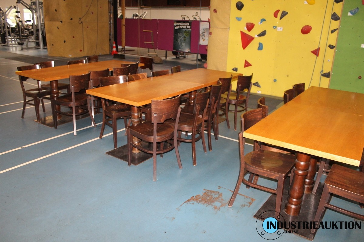 Tisch, ca. 200x80 cm, Tische 5 St. ca. 120x80 und 1x 80x80 cm, dazu Holzstühle braun, ca. 42 St.,