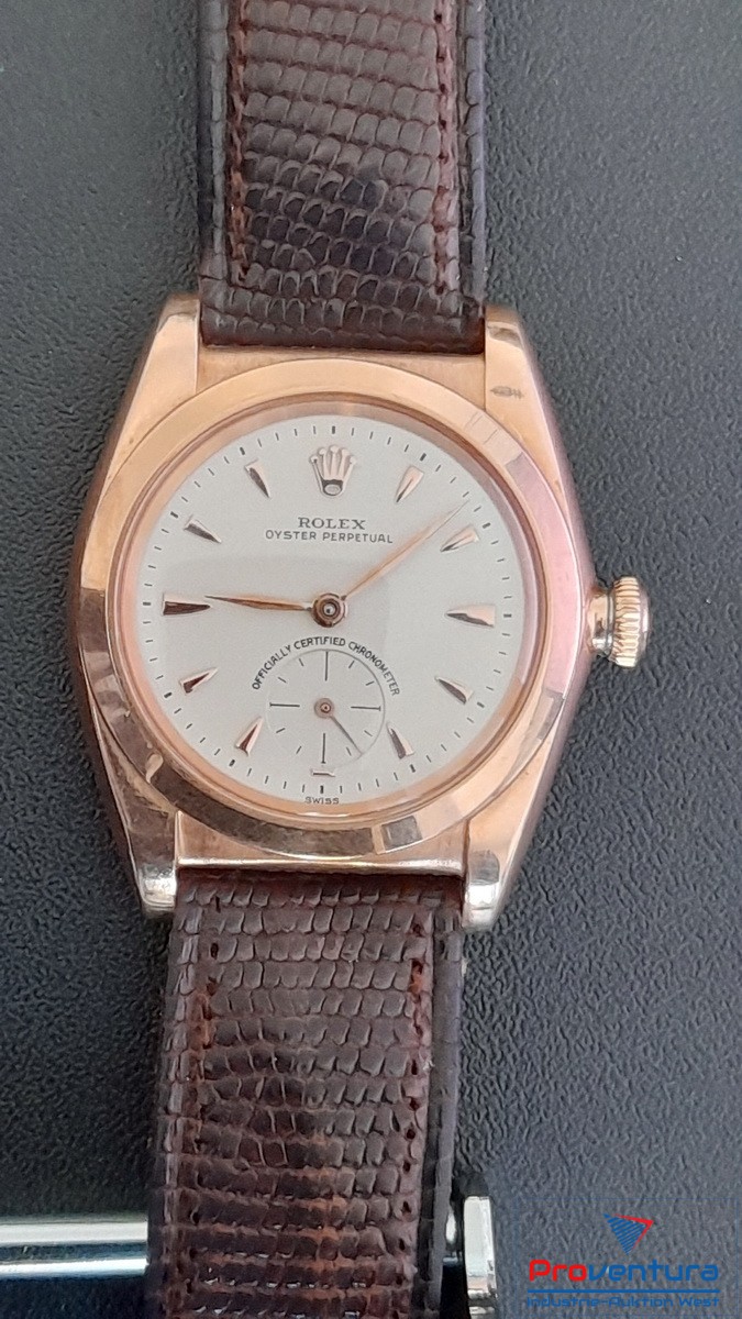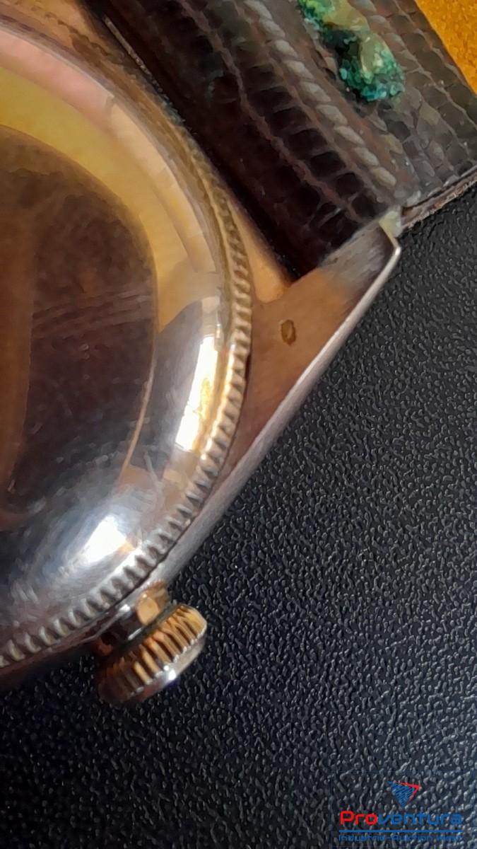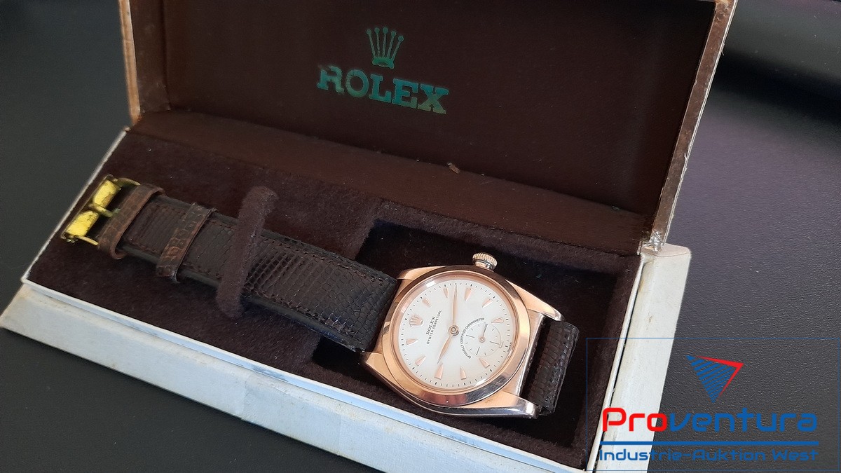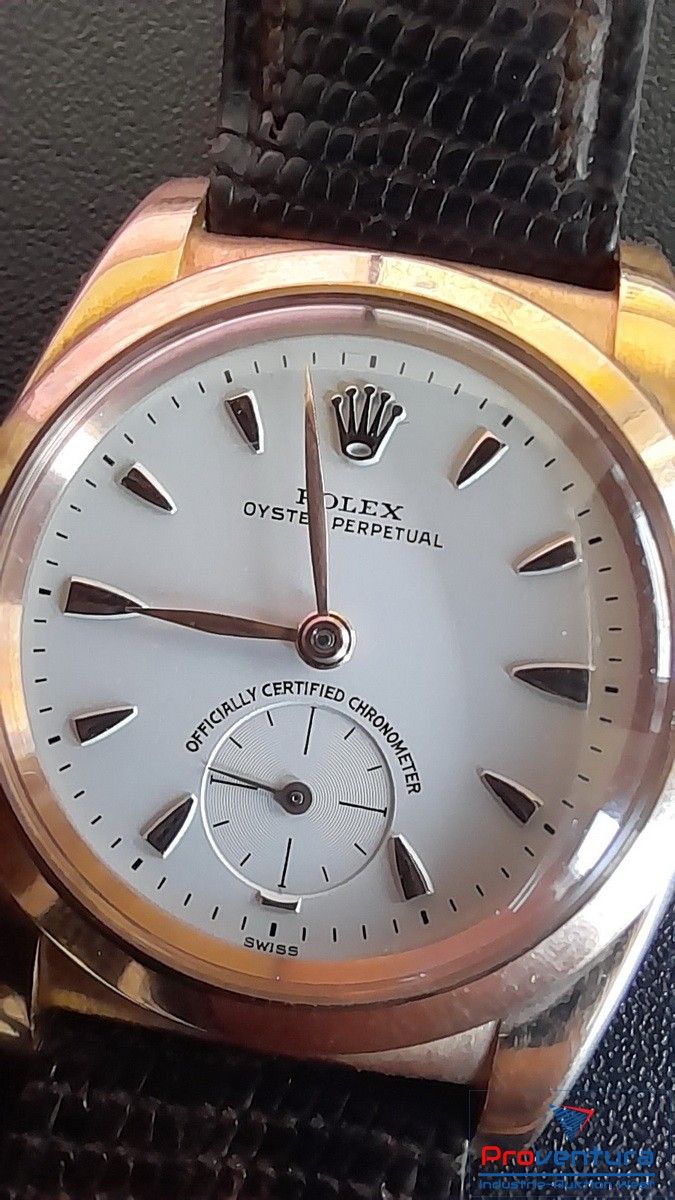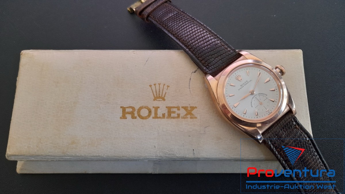 Armbanduhr ROLEX Oyster Perpetual, aus Nachlass, S/N 553418, Handaufzug, gemäß Internet Bj. 1947 oder 1960, ø ca. 30 mm, großes Eichhörnchen lt Internet: Garantiepunze für große Goldartikel aus Schweizer Produktion, verwendet seit 17. Mai 1881. Sie garantiert einen Mindestfeingehalt von 583/1000 (14 Karat). Höhe der Punze: 2 mm, Breite: 1,5 mm, braunes Lederarmband nicht original, in Originalbox, ohne Original-Papiere.
