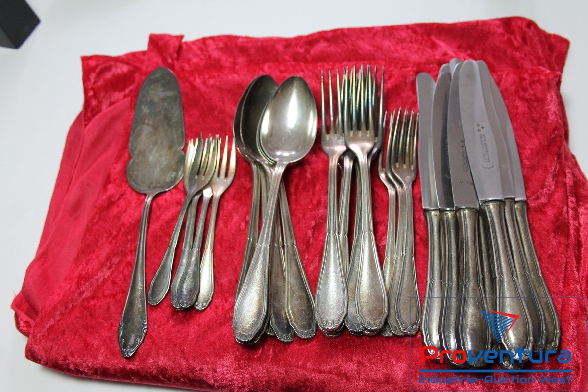 Besteck OTTO HAMMESFAHR, 12 Menümesser (nur Griff versilbert), 8 Menügabeln, 8 Menülöffel, 3 Frühstücksgabeln, 6 Kuchengabeln, 1 Tortenheber, versilbert 90 und 100