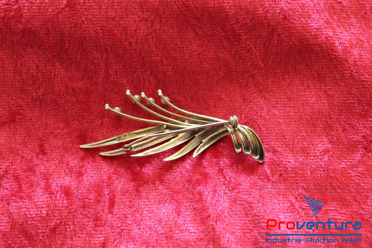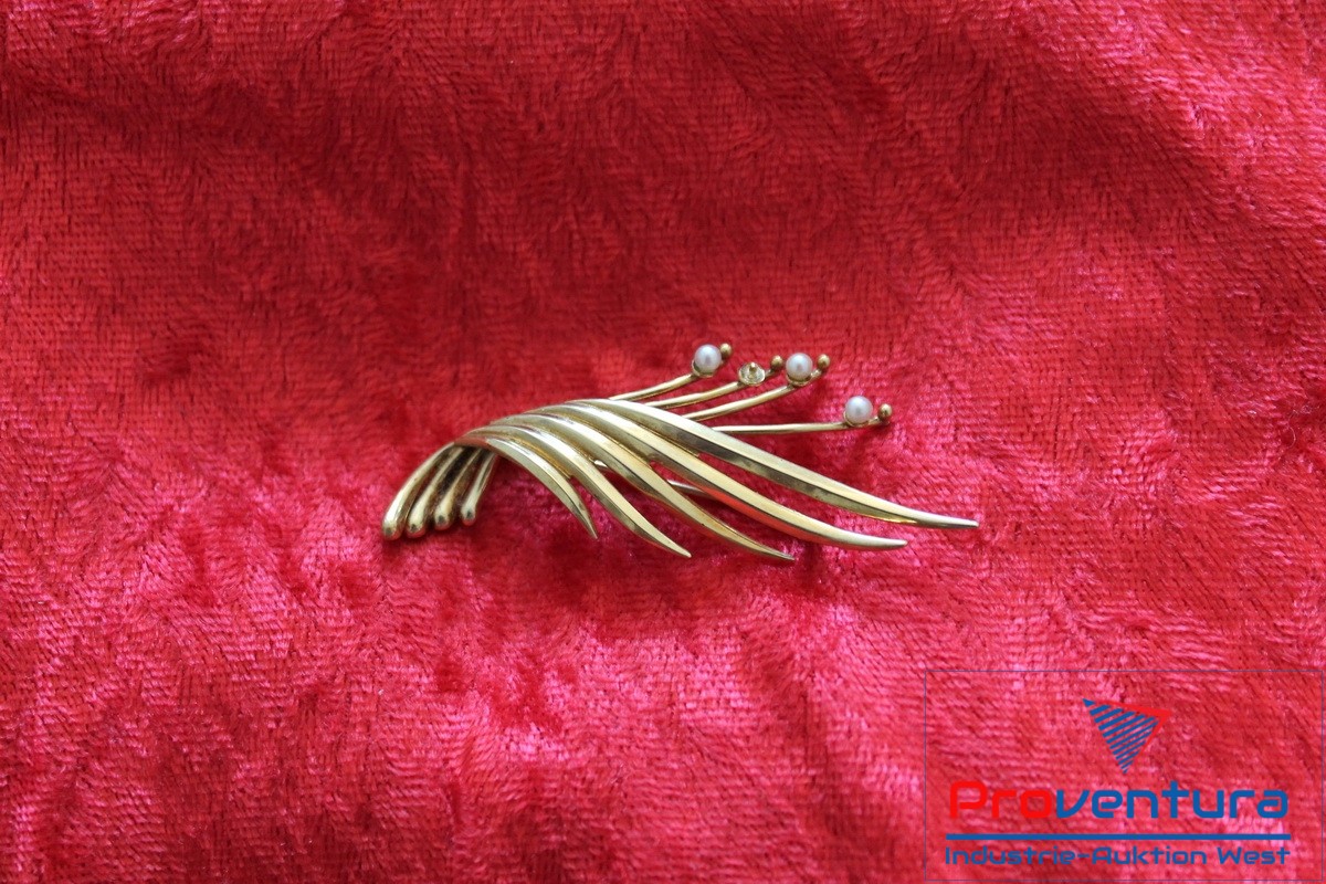 Brosche 585er Gold Länge ca. 60 mm, Gewicht ca. 5,48 g, m. 3 Perlen 1 Perle fehlt