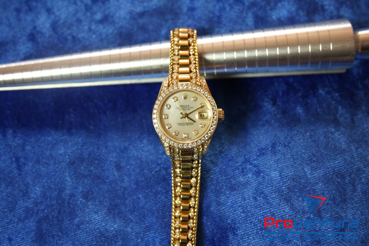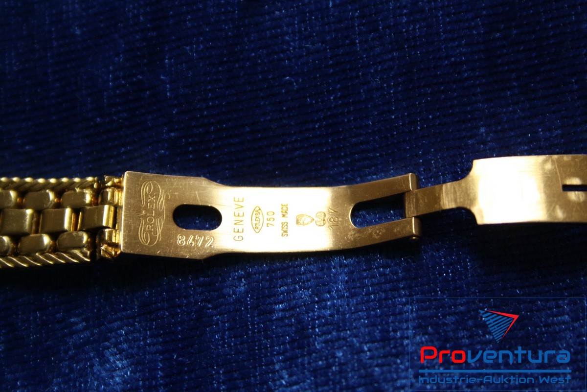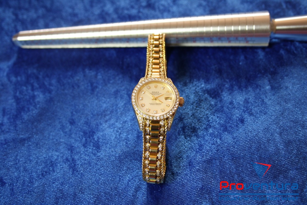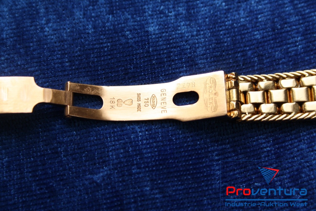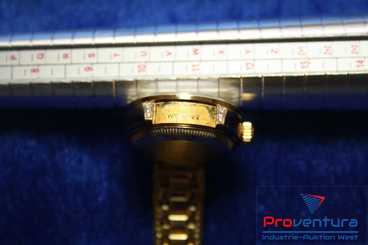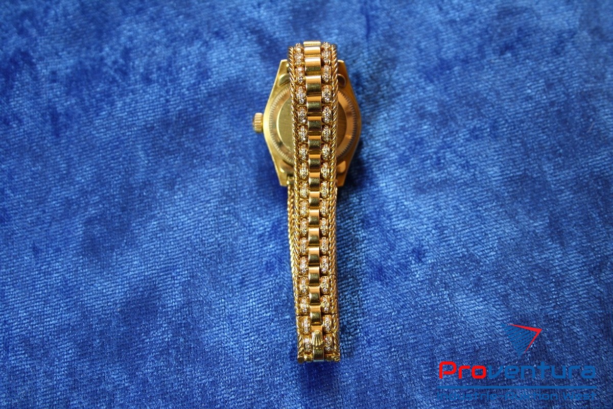 Damenarmbanduhr ROLEX Lady-Datejust 26, 750er Gold, Automatik, Gewicht ca. 85,5 g, S/N W030199, Nr. 8472, Besonderheiten: seltenes Stück, ca. 10 Brillanten a. d. Permutt-Ziffernblatt, ca. 256 Brillanten im Armband, ohne Papiere, ohne Box, Goldwert ca. 2.500