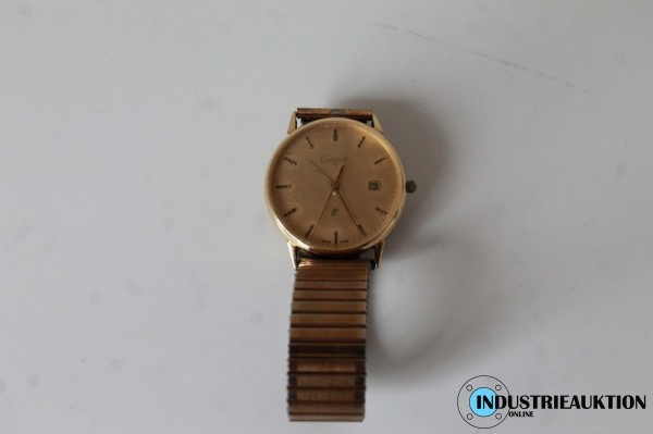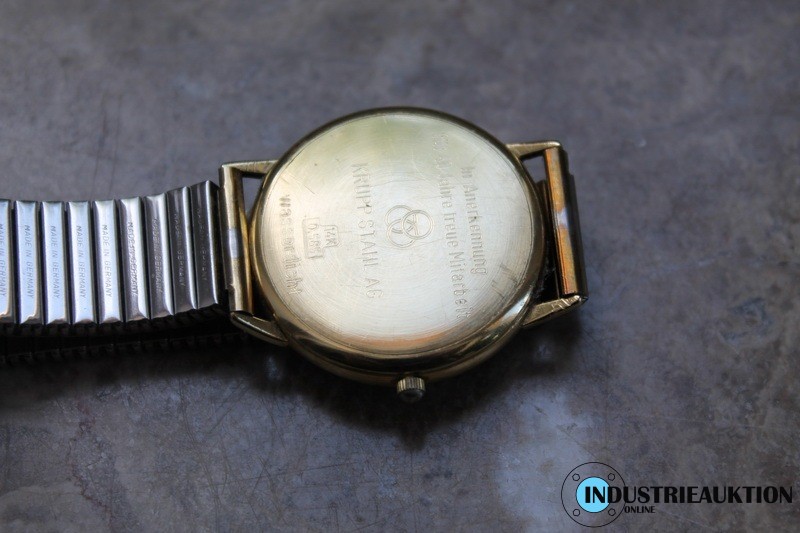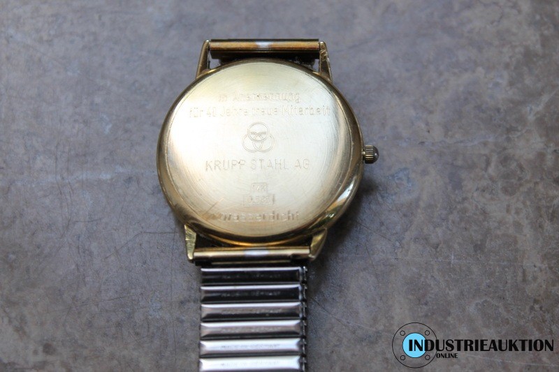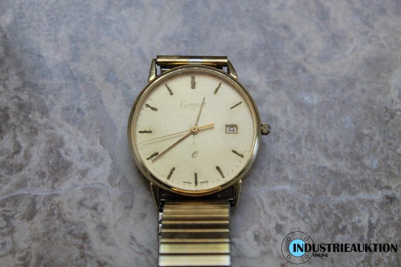 Herrenarmbanduhr CORANET 14 Karat Gehäuse, Gravur "In Anerkennung für 40 Jahre treue Mitarbeit KRUPP STAHL AG", Gewicht ca. 46,06 g, ø Gehäuse ca. 30 mm, Stretcharmband, Funktion geprüft.