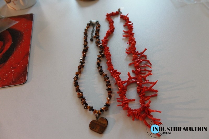 Ketten 2 St., evtl. Tigerauge und Koralle, Länge ca. 40 und 52 cm, 1x mit Anhänger