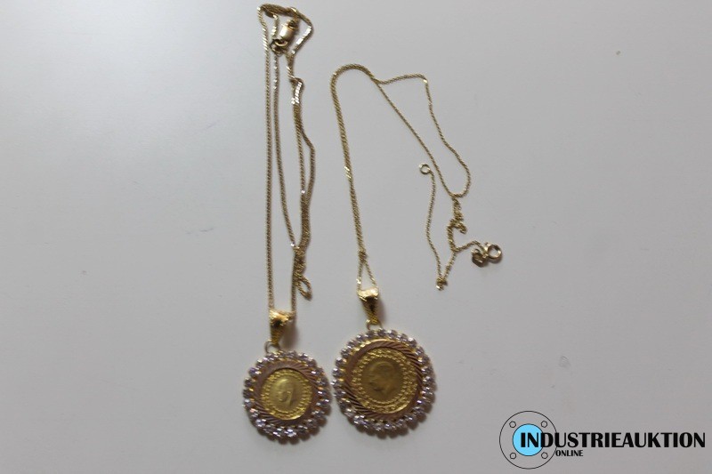 Goldkette 14 K Länge ca. 40 cm Gewicht ca. 1,04 g, mit Anhänger 585er Gold ø ca. 25 mm Gewicht ca. 6 g mit Steinen, Goldkette 14 K Länge ca. 40 cm Gewicht ca. 2,4 g, mit Anhänger 585er Gold ø ca. 23 mm Gewicht ca. 4 g