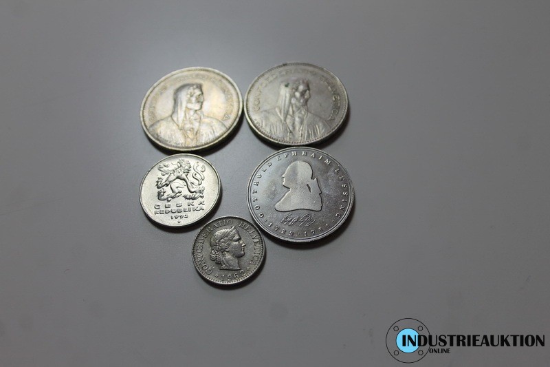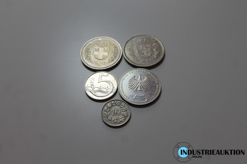Münzen 2x 5 Schweizer Franken, 1x 10 Rappen, 1x 5 Deutsche Mark, 1x 5 Kc Tschechische Republik