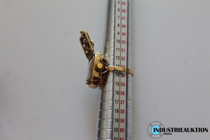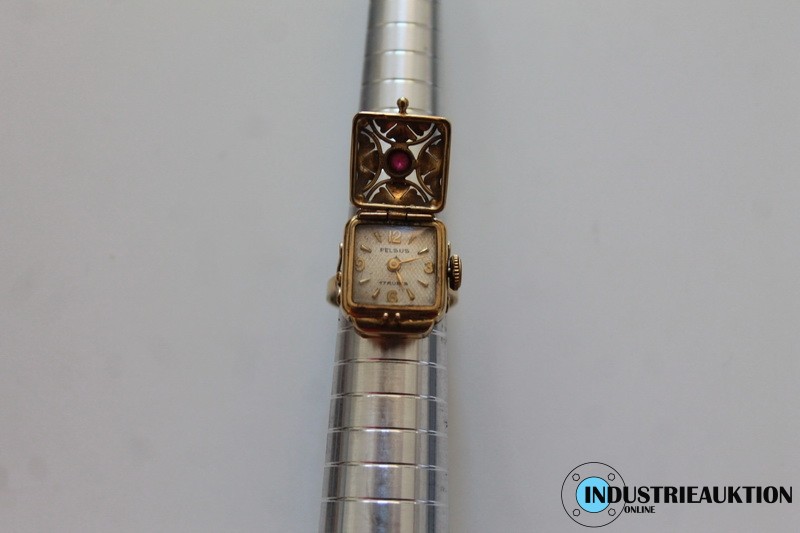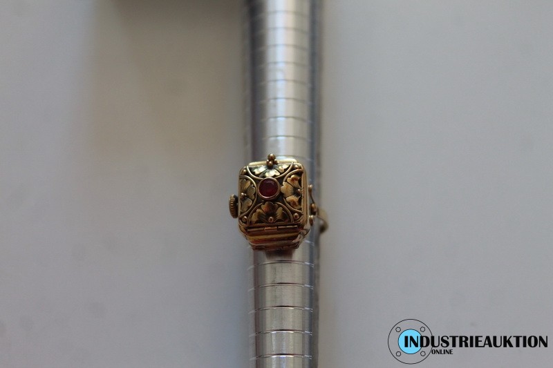 Ring 585er Gold ø ca. 18 mm, mit eingearbeiteter Uhr FELSUS mit Stein, Gewicht ca. 8,82 g