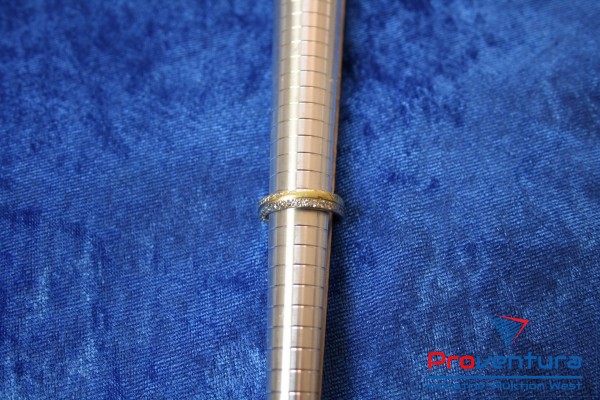 Ring 750er Gold bicolor, ø ca. 18 mm, Gewicht ca. 5,06 g, ca. 56 Brillanten 0,60 ct TW vs, 2 fehlen, Gravur Dieter 6.5.88
